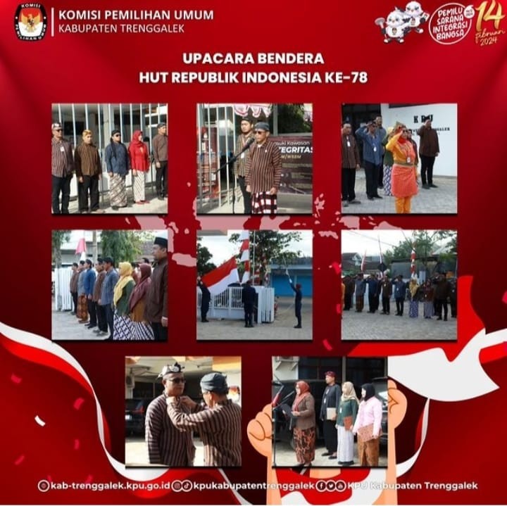Hari ini, Kamis, tanggal 17 Agustus 2023, di halaman Kantor KPU Kabupaten Trenggalek tampak berbaris rapi seluruh pegawai KPU Kabupaten Trenggalek. Para pegawai yang terdiri atas Komisioner dan Sekretariat KPU Kabupaten Trenggalek berbusana adat yang menunjukkan khasanah budaya Indonesia.