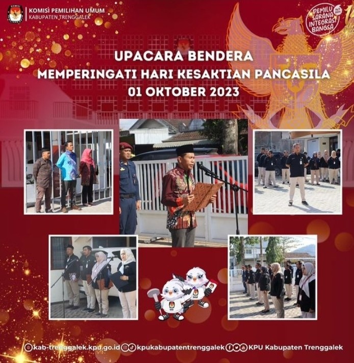 Hari Minggu, tanggal 1 Oktober 2023, di halaman Kantor KPU Kabupaten Trenggalek, seluruh pegawai KPU Kabupaten Trenggalek berbaris rapi mengikuti Upacara Peringatan Hari Kesaktian Pancasila 1 Oktober 2023. Upacara dimulai pukul 08.00 WIB. Bertindak sebagai Komandan Upacara adalah Nanang Eko Prasetyo, Kasubbag Teknis Penyelenggaraan Pemilu, Partisipasi dan Hubungan Masyarakat. Inspektur upacara adalah Gembong Derita Hadi, Ketua KPU Kabupaten Trenggalek. Upacara dimulai dengan persiapan barisan, dilanjutkan dengan penghormatan dan laporan kepada Inspektur Upacara dipimpin oleh Komandan Upacara. Setelah itu, penghormatan kepada Bendera Merah-Putih diiringi Lagu Kebangsaan Indonesia Raya, dan dilakukan mengheningkan cipta serta pembacaan Pembukaan Undang-Undang Dasar Negara Republik Indonesia Tahun 1945. Upacara dilanjutkan pembacaan ikrar dan amanat Inspektur Upacara.