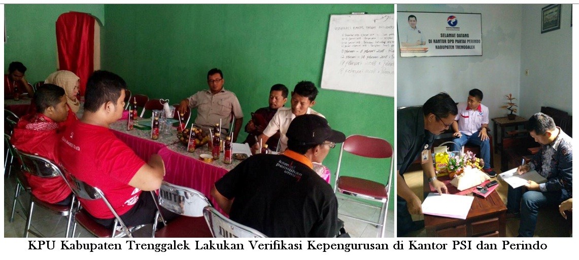 Hari-hari belakangan ini, tim verifikasi KPU Kabupaten Trenggalek turun ke desa-desa untuk melakukan verifikasi faktual terhadap kepengurusan dan keanggotaan partai politik. Ada dua partai politik yang diverifikasi, yaitu Partai Persatuan Indonesia (Perindo) dan Partai Solidaritas Indonesia (PSI) cabang Trenggalek.