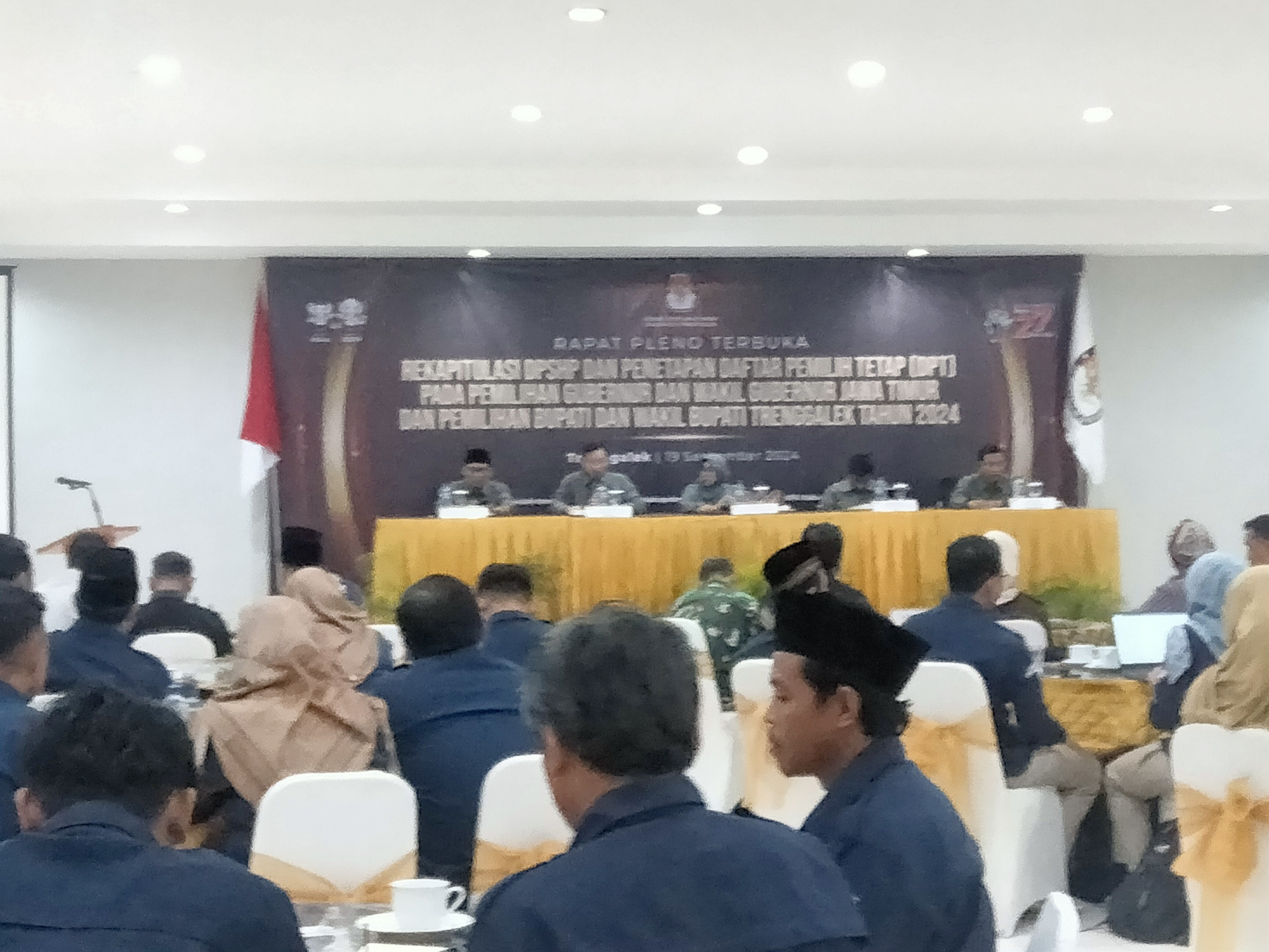 Acara dilanjutkan Rapat Pleno Terbuka Rekapitulasi DPSHP dan Penetapan DPT Pemilihan Gubernur dan Wakil Gubernur Jawa Timur serta Pemilihan Bupati dan Wakil Bupati Trenggalek 2024 yang dipandu oleh Mahbubil Umam, Anggota KPU Kabupaten Trenggalek Divisi Perencanaan, Data dan Informasi.