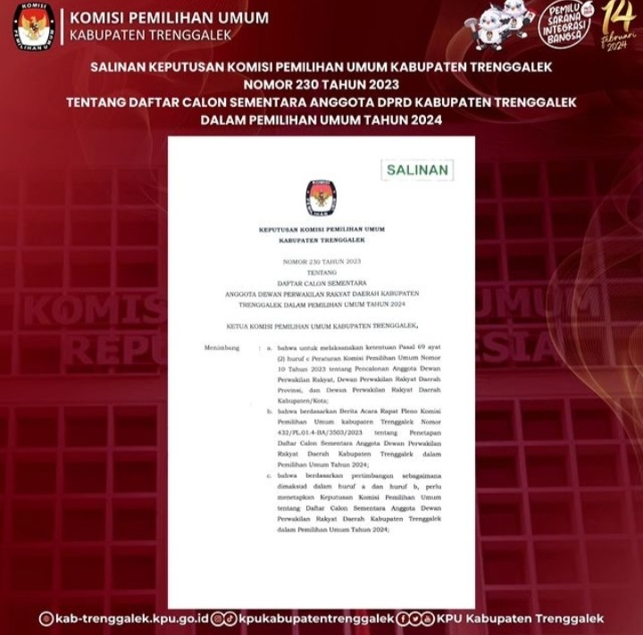 KPU Trenggalek Tetapkan Daftar Calon Sementara (DCS) Anggota DPRD Kabupaten Trenggalek Pemilu Tahun 2024