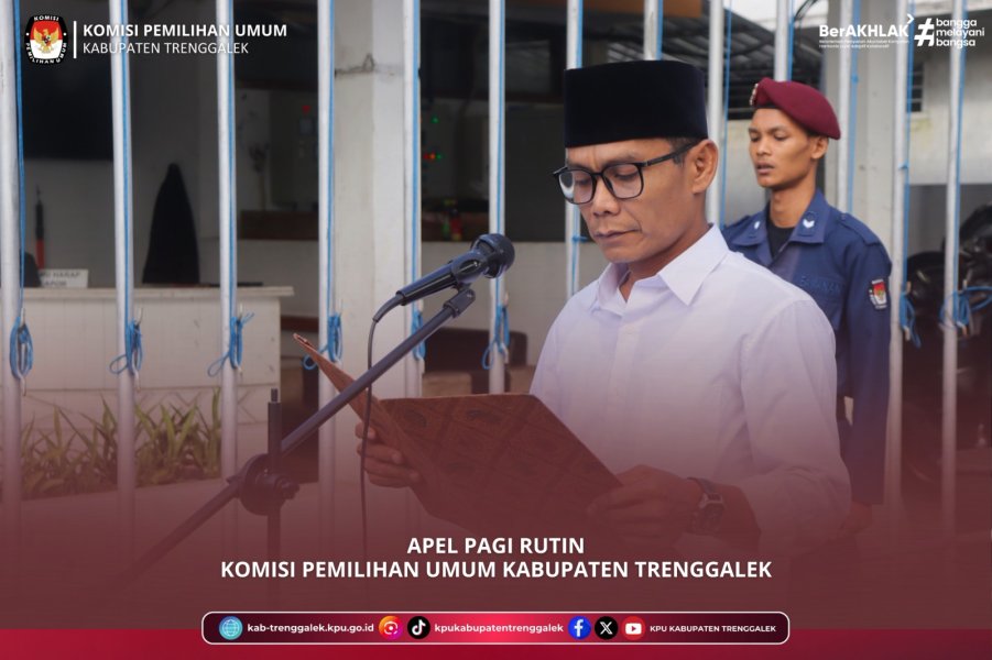 Hari ini, Senin, 30 Juni 2025, Komisi Pemilihan Umum Kabupaten Trenggalek menyelenggarakan Apel Pagi Rutin. Kegiatan yang diselenggarakan di halaman Kantor KPU Kabupaten Trenggalek tersebut dihadiri oleh seluruh Komisioner dan Sekretaris beserta jajaran Sekretariat KPU Kabupaten Trenggalek. Bertindak sebagai Pembina Apel adalah Ali Sadad, Anggota KPU Kabupaten Trenggalek Divisi Teknis Penyelenggaraan, dan Pemimpin Apel adalah Akhmad Rudy Bastari, Kasubbag Keuangan Umum, dan Logistik. Sedangkan sebagai Pembaca Pembukaan UUD 1945 adalah Rudi Susanto, Pelaksana Subbag Perencanaan, Data, dan Informasi, Pembaca Panca Prasetya KORPRI adalah Chormen Rukmawan, pelaksana Subbag Keuangan, Umum dan Logistik, Pembaca Doa adalah Agus Widodo, Pelaksana Subbag Keuangan, Umum, dan Logistik. Apel pagi dimulai tepat pukul 08.00 WIB oleh MC, Wulan Setyaningsih, pelaksana Subbag Perencanaan, Data dan Informasi.
