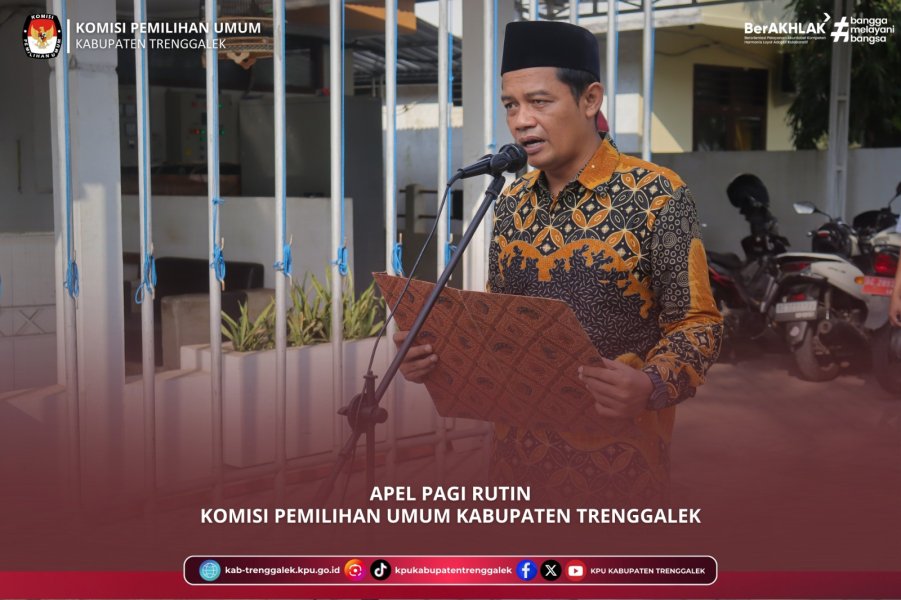 Bertindak sebagai Pembina Apel adalah Imam Nurhadi, Anggota KPU Kabupaten Trenggalek Ketua Divisi Sosialisasi, Pendidikan Pemilih, Partisipasi Masyarakat dan Sumber Daya Manusia. Sedangkan sebagai Pemimpin Apel adalah Agung Tri Laksana, Plt. Kasubbag Teknis Penyelenggaraan Pemilu dan Hukum. Sementara itu petugas Pembaca Pembukaan UUD 1945 adalah Yunike Ayuning Priyastuti, Pelaksana pada Subbag Partisipasi Masyarakat dan Sumber Daya Manusia, sebagai Pembaca Panca Prasetya KORPRI adalah Woro Wikan Maheswari, pelaksana Subbag Teknis Penyelenggaraan Pemilu dan Hukum, dan Pembaca Doa adalah Abdul Basith Umami, pelaksana Subbag Teknis Penyelenggaraan Pemilu dan Hukum, serta Ajudan Pembina Apel adalah Rokhip Abduloh, Jagat Saksana. Apel dimulai tepat pukul 08.00 WIB oleh MC, Lilis Suryani, Pelaksana Subbag Teknis Penyelenggaraan Pemilu dan Hukum.