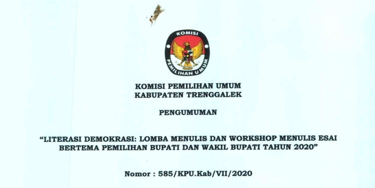 Dalam rangka melakukan kegiatan Sosialisasi dan Pendidikan Pemilih untuk meningkatkan Partisipasi Masyarakat dalam Pemilihan Bupati dan Wakil Bupati Trenggalek tahun 2020, Komisi Pemilihan Umum Kabupaten Trenggalek akan mengadakan kegiatan “LITERASI DEMOKRASI: Lomba dan Workshop Menulis bertema Pemilihan 2020” dengan total hadiah 7,5 Juta.
