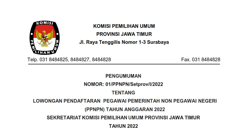 Berikut disampaikan pengumuman nomor: 01/PPNPN/Setprov/I/2022 tentang Lowongan Pendaftaran Pegawai Pemerintah Non Pegawai Negeri(Ppnpn) Tahun Anggaran 2022 Di Lingkungan Sekretariat Komisi Pemllihan Umum Provinsi Jawa Timur Tahun 2022.