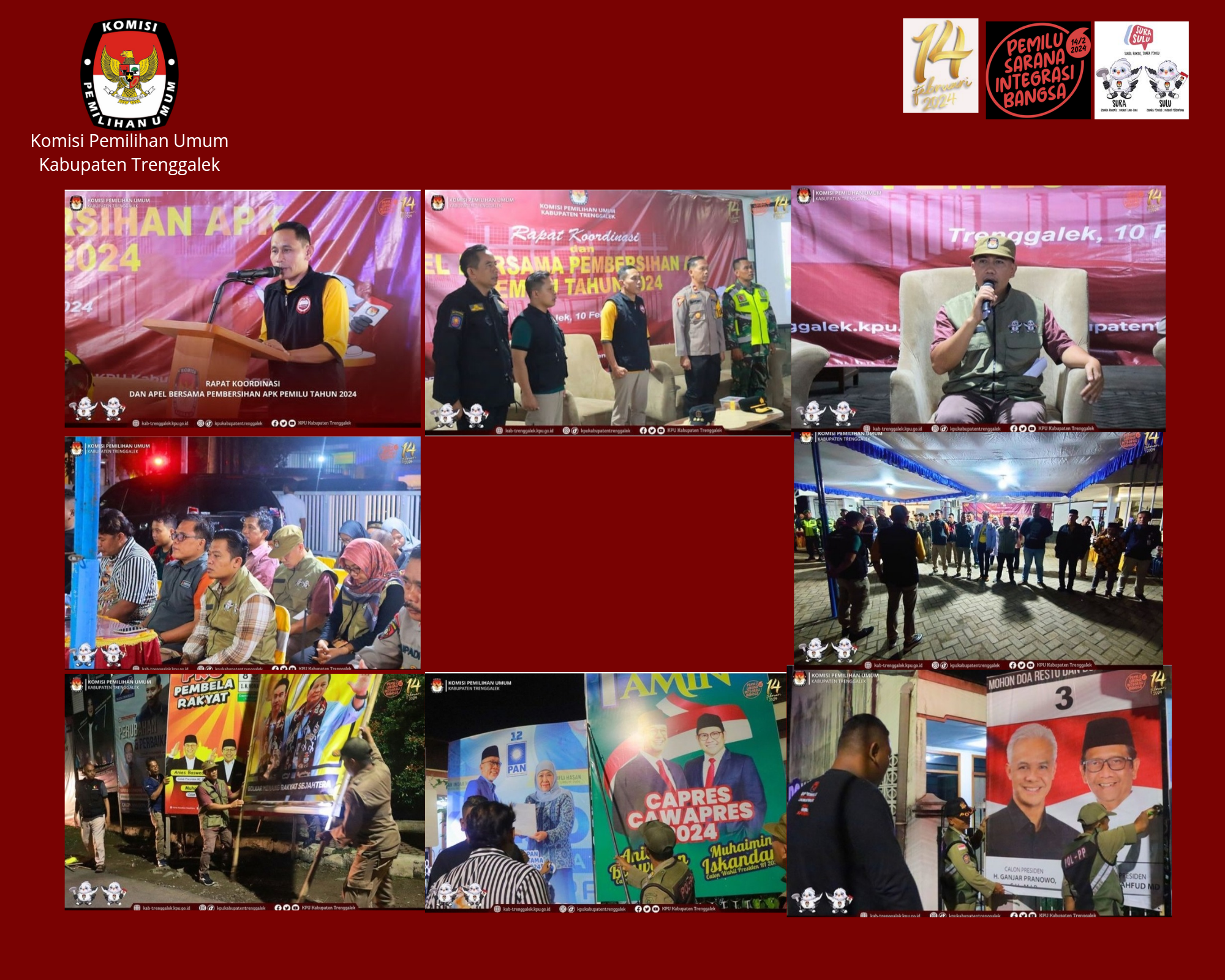 Menurut Nurani, Anggota KPU Kabupaten Trenggalek Divisi Sosialisasi, Pendidikan Pemilih, Partisipasi Masyarakat dan Sumber Daya Manusia, bahwa berdasarkan pasal 36 ayat (7) Peraturan KPU Nomor 15 Tahun 2023 tentang Kampanye Pemilihan Umum menyatakan bahwa Alat Peraga Kampanye wajib dibersihkan oleh peserta Pemilu paling lambat 1 (satu) hari sebelum Hari Pemungutan Suara. Lebih lanjut dijelaskannya bahwa berdasarkan Ketentuan Bab IV Huruf a angka 3 Keputusan KPU Nomor 1621 tentang Pedoman Teknis Pelaksanaan Kampanye bahwa pada saat memasuki masa tenang, KPU berkoordinasi dengan Peserta Pemilu, Bawaslu, dan Pemerintah Daerah setempat, dan berdasarkan surat dari KPU Jawa Timur bahwa Pembersihan APK dilakukan mulai tanggal 11 Februari 2024 pukul 00.00 WIB yang terlebih dahulu dilakukan koordinasi antara KPU Kabupaten Trenggalek, peserta Pemilu, Bawaslu Kabupaten Trenggalek, dan Pemerintah Kabupaten Trenggalek dalam melakukan pembersihan APK. Pembersihan APK harus terus dilakukan sampai seluruh APK bersih sehingga pada hari pemungutan suara tidak ada lagi APK terpasang di tempat mana pun.