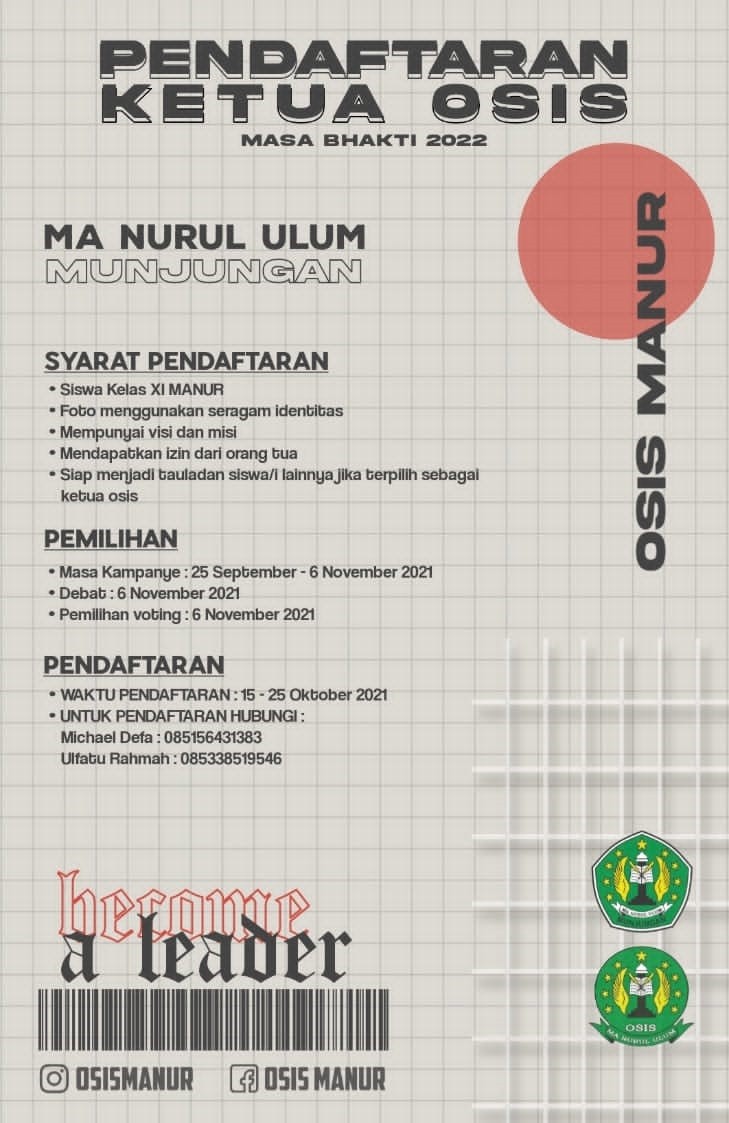 Tahapan pemilihan Ketua OSIS di MA Nurul Ulum dimulai dengan tahapan pendaftaran, penetapan calon ketua, kampanye, dan pemungutan suara. Pendaftaran calon ketua dilakukan pada tanggal 15-25 Oktober 2021 yang lalu. Yang boleh mencalonkan adalah Siswa Kelas X dan kelas XI saja. Mereka harus menyusun menyusun Visi dan Missi. Mereka harus mendapat izin dari orang tua, serta harus siap menjadi tauladan.