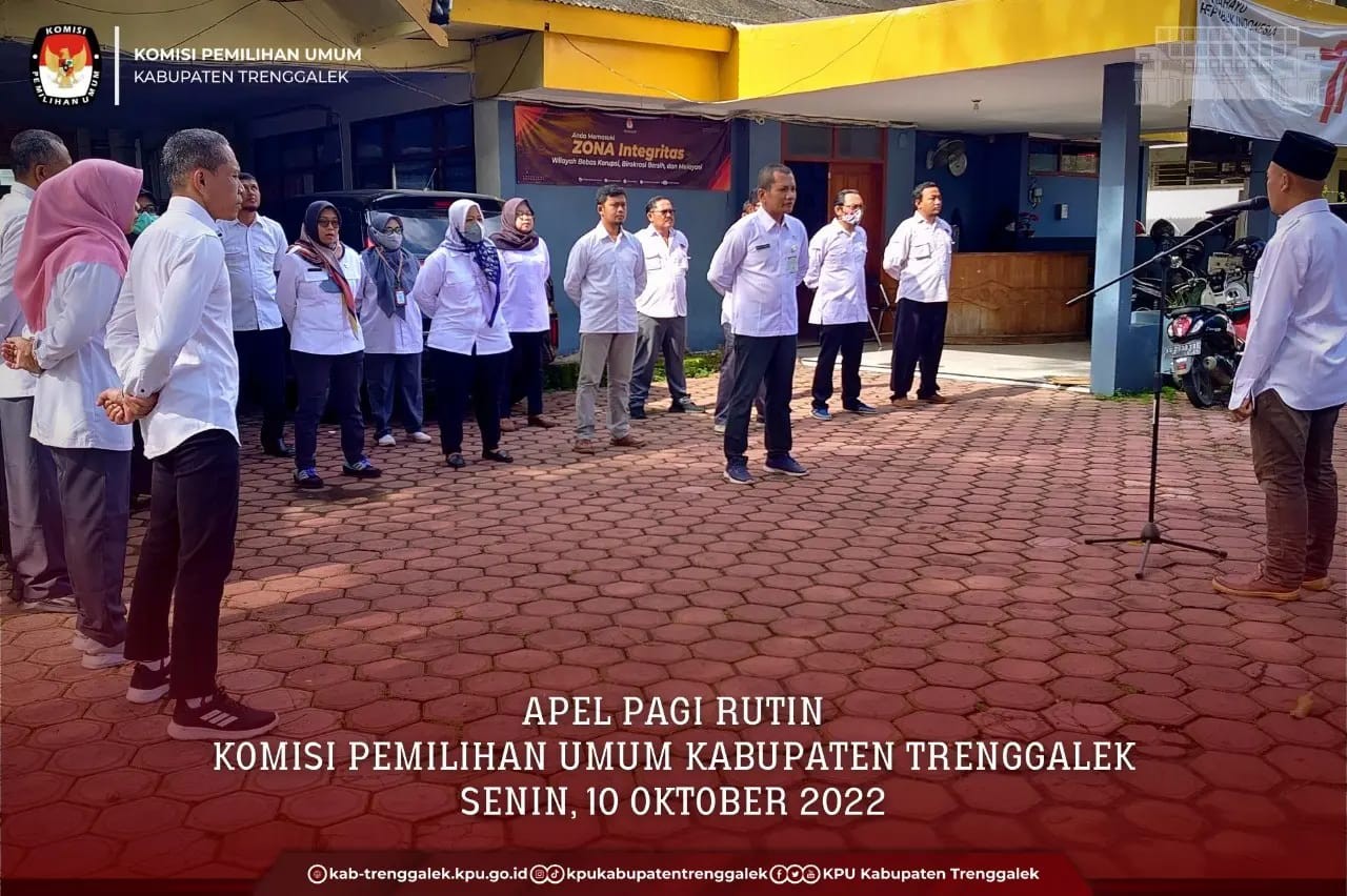 TRENGGALEK— Hari ini, Senin, tanggal 10 Oktober 2022, seluruh pegawai KPU Kabupaten Trenggalek, baik Komisioner, Sekretaris, Kasubbag maupun Staf PNS dan PPNPN berbaris rapi mengikuti Apel Pagi Rutin yang diselenggarakan tiap hari Senin dan dimulai pukul 08.00 WIB. Apel pagi merupakan wujud kedisiplinan seluruh pegawai dan sebagai langkah awal untuk menyiapkan kerja dalam satu minggu.