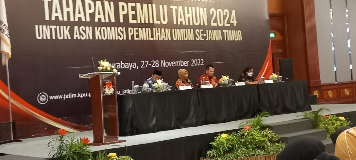 TRENGGALEK – ASN KPU Kabupaten Trenggalek bersama ASN KPU Kab/Kota Se Jatim hadir dalam Rapat konsolidasi Tahapan Pemilu 2024 untuk ASN Se- Jatim yang digelar oleh KPU Provinsi Jawa Timur pada tanggal 27-28 November 2022.