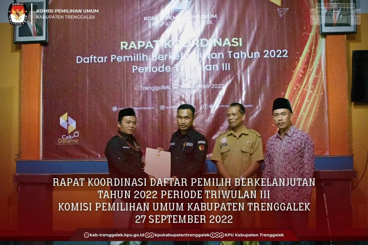 TRENGGALEK— Komisi Pemilihan Umum (KPU) Kabupaten Trenggalek mengakhiri rangkaian Pemutakhiran Daftar Pemilih Berkelanjutan (PDPB) Tahun 2022 dengan menetapkan Daftar Pemilih Berkelanjutan (DPB) sejumlah 578.297 dengan rincian Pemilih laki-laki berjumlah 288.196 dan Pemilih perempuan berjumlah 290.101, Selasa (27/09/2022).