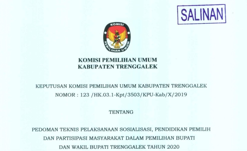 Berikut disampaikan Keputusan Komisi Pemilihan Umum Kabupaten Trenggalek Nomor: 123/HK.03.1-Kpt/3503/KPU-Kab/X/2019 Tentang Pedoman Teknis Pelaksanaan Sosialisasi, Pendidikan Pemilih, dan Partisipasi Masyarakat dalam Pemilihan Bupati dan Wakil Bupati Trenggalek Tahun 2020.