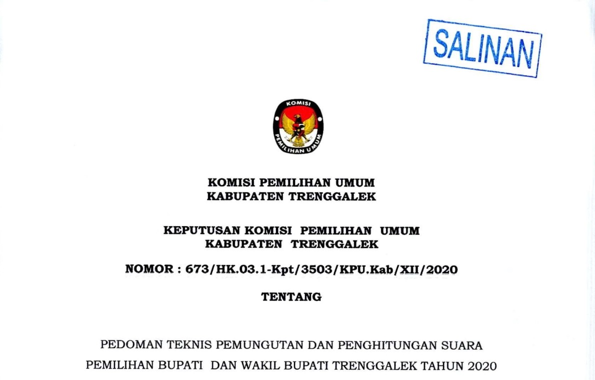 Berikut disampaikan KEPUTUSAN KOMISI PEMILIHAN UMUM KABUPATEN TRENGGALEK NOMOR : 673/HK.03.1-Kpt/3503/KPU.Kab/XlI/2020 TENTANG PEDOMAN TEKNIS PEMUNGUTAN DAN PENGHITUNGAN SUARA PEMILIHAN BUPATI DAN WAKIL BUPATI TRENGGALEK TAHUN 2020.