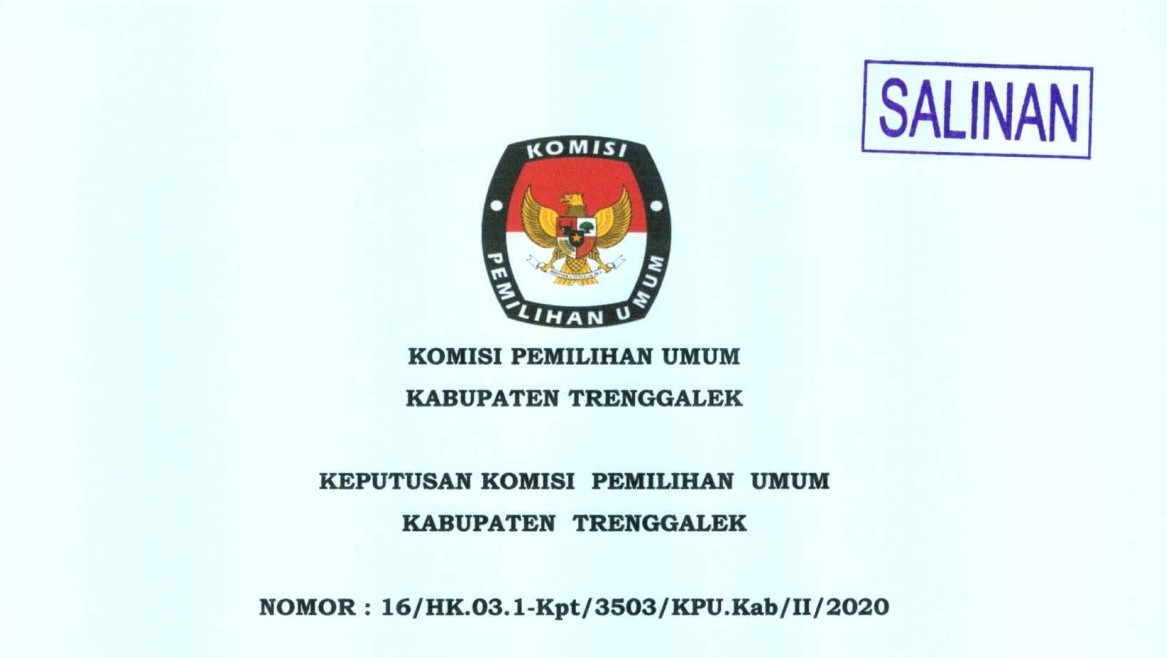 Berikut disampaikan Keputusan Komisi Pemilihan Umum Kabupaten Trenggalek nomor: 16/HK.03.1-Kpt/3503/KPU.Kab/II/2020 tentang Pedoman Teknis Pemutakhiran Data dan Penyusunan Daftar Pemilih dalam Pemilihan Bupati dan Wakil Bupati Trenggalek Tahun 2020.