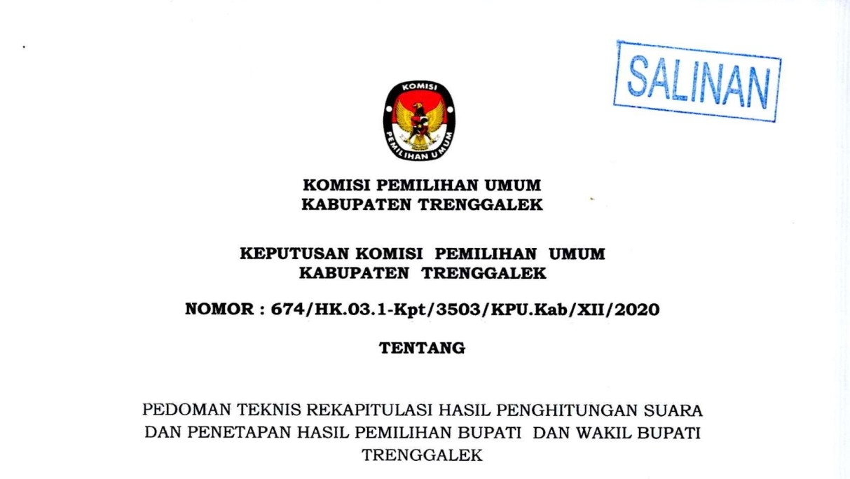 Berikut disampaikan KEPUTUSAN KOMISl PEMILIHAN UMUM KABUPATEN TRENGGALEK NOMOR : 674/HK.03.1-Kpt/3503/KPU.Kab/XII/2020 TENTANG PEDOMAN TEKNIS REKAPITULASl HASIL PENGHITUNGAN SUARA DAN PENETAPAN HASIL PEMILIHAN BUPATI DAN WAKIL BUPATI TRENGGALEK 2020.