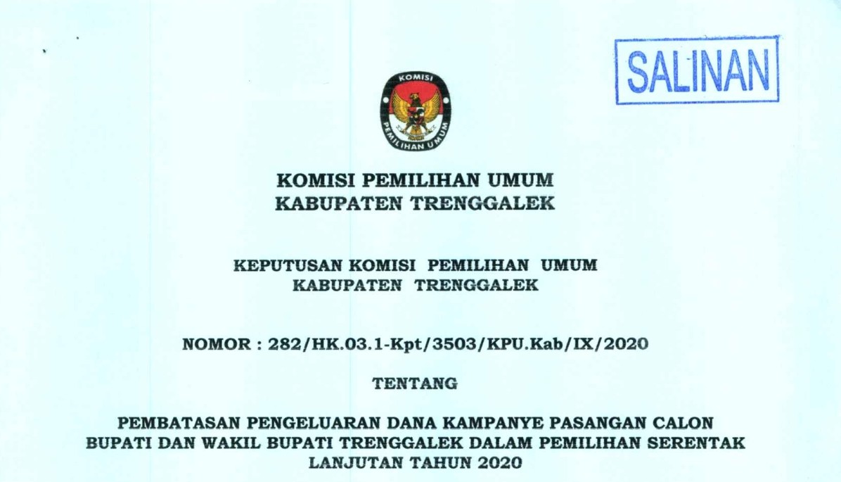 Berikut disampaikan KEPUTUSAN KOMISI PEMILIHAN UMUM KABUPATEN TRENGGALEK NOMOR : 282/HK.03.1-Kpt/3503/KPU.Kab/IX/2020 TENTANG PEMBATASAN PENGELUARAN DANA KAMPANYE PASANGAN CALON BUPATI DAN WAKIL BUPATI TRENGGALEK DALAM PEMILIHAN SERENTAK LANJUTAN TAHUN 2020.