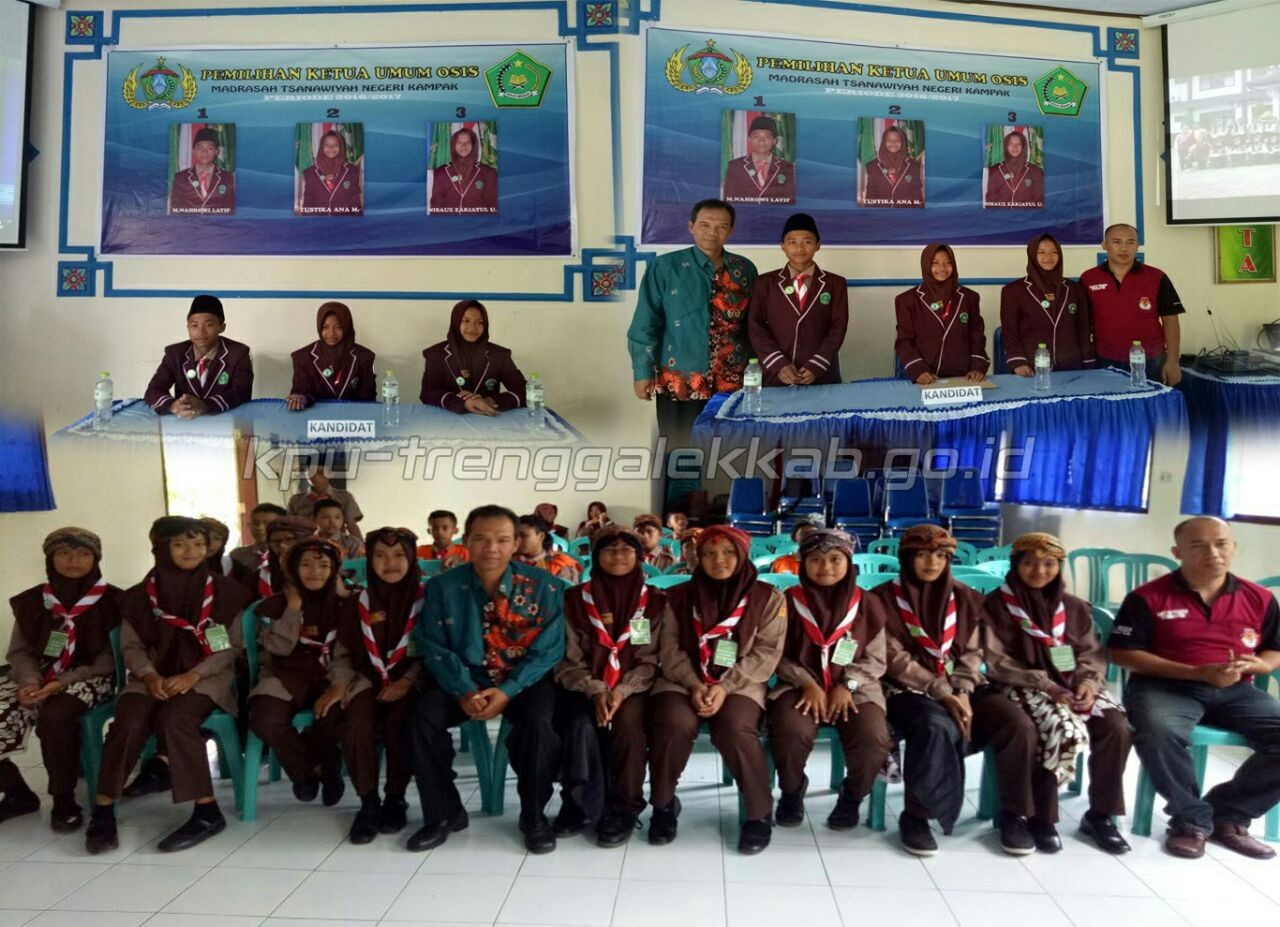 Sebagai rangkaian kegiatan KPU Kabupaten Trenggalek dalam memberikan technical assistant PEMILOS (Pemilihan Ketua OSIS) di MTsN Kampak, hari ini adalah puncak acara pemilihan yang sudah dipersiapkan beberapa minggu yang lalu. Setelah diawali dengan bimtek kepanitiaan, pembekalan dan pendampinan penyampaian visi-misi-program dan persiapan penyediaan logistik dan TPS (Tempat Pemungutan Suara), pada hari Jum’at (21/10/2016) bertempat di AULA MTsN Kampak dilaksanakan pemungutan suara Calon Ketua Osis untuk masa bhakti 2016-2017.