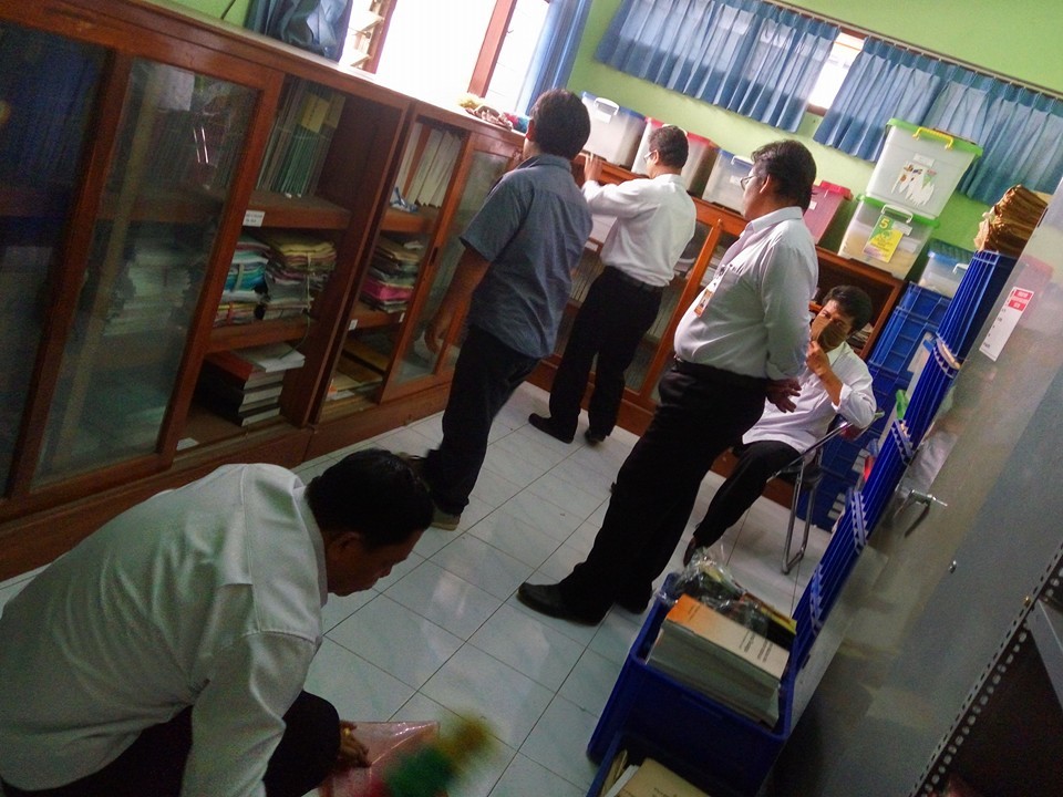 “Ruangannya cukup sempit, debu-debu masuk lewat jendela. Makanya, kami tata ulang posisi lemari. Sebab, kalau tidak, sulit untuk menerobos ke rak-rak arsip lainnya”, kata Sujoko yang baru saja menata data arsip yang dalam bingkai kaca. Pembingkaian data itu ia maksudkan agar mudah dipasang di dinding yang memuat data dan arsip apa saja yang ada di ruangan itu.