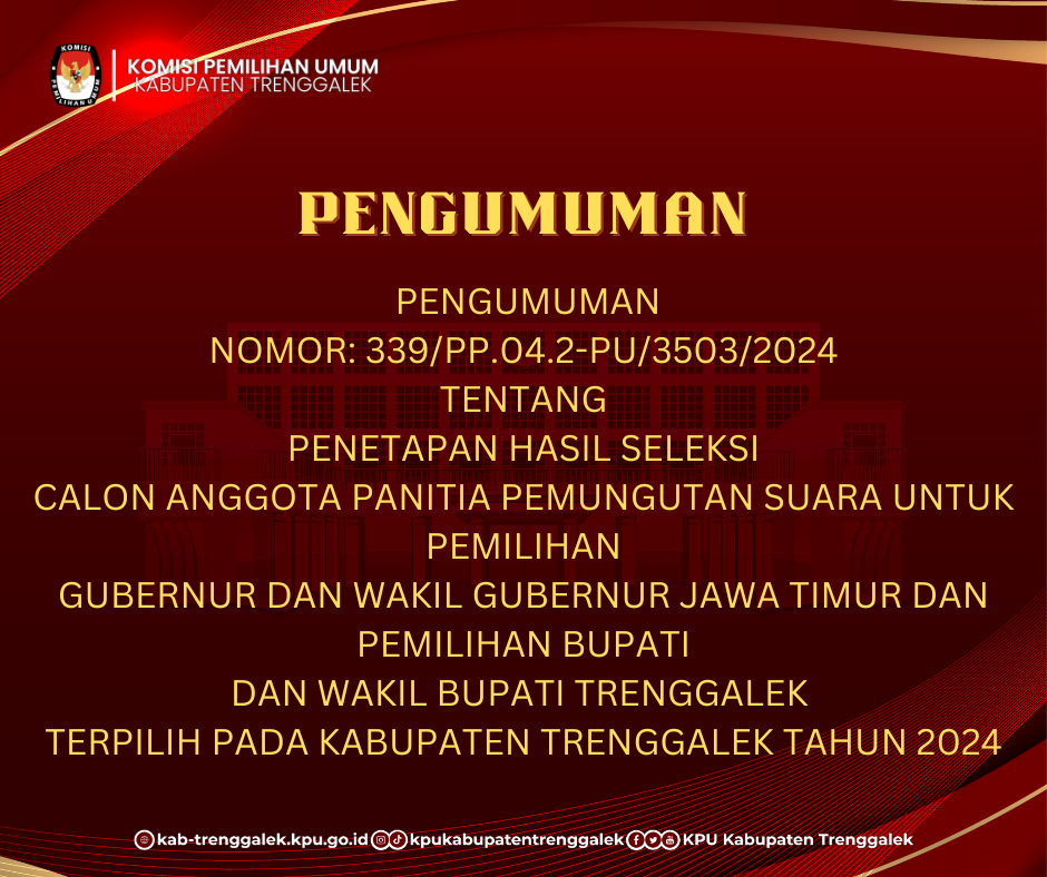 PENETAPAN HASIL SELEKSI CALON ANGGOTA PPS UNTUK PEMILIHAN GUBERNUR DAN WAKIL GUBERNUR JAWA TIMUR DAN PEMILIHAN BUPATI DAN WAKIL BUPATI TRENGGALEK TERPILIH PADA KABUPATEN TRENGGALEK TAHUN 2024