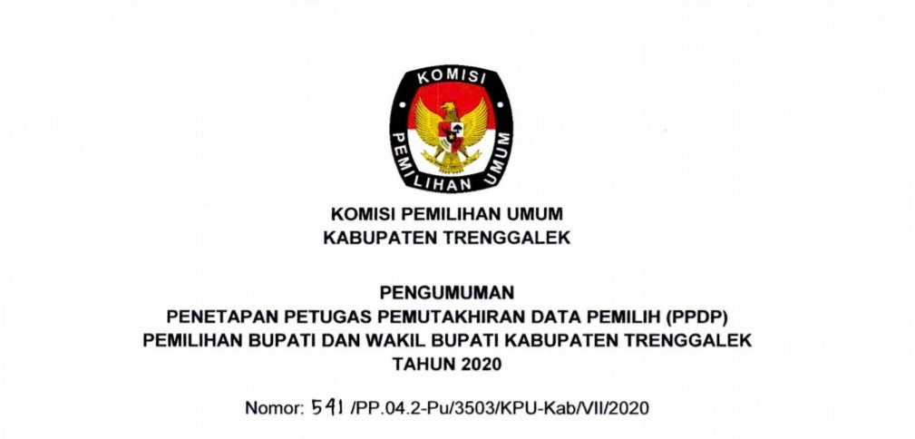 Berikut disampaikan pengumuman nomor: 541/PP.04.2-Pu/3503/KPU-Kab/VII/2020 tentang penetapan petugas pemutakhiran data pemilih (PPDP) dalam Pemilihan Bupati dan Wakil Bupati Trenggalek tahun 2020.