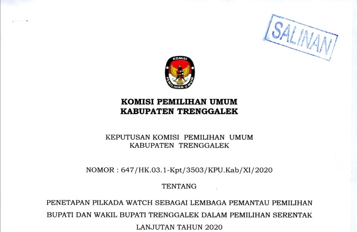 PENETAPAN PILKADA WATCH SEBAGAI LEMBAGA PEMANTAU PEMILIHAN BUPATI & WAKIL BUPATI TRENGGALEK DALAM PEMILIHAN SERENTAK LANJUTAN 2020
