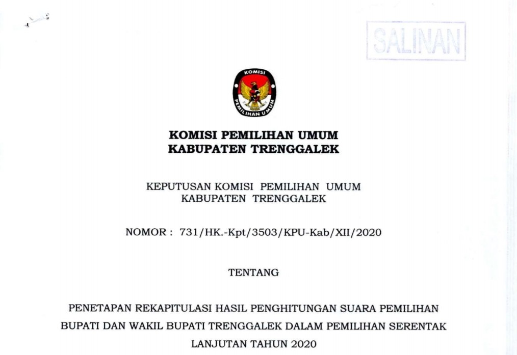 Berikut disampaikan KEPUTUSAN KOMISI PEMILIHAN UMUM KABUPATEN TRENGGALEK NOMOR : 731/HK.-Kpt/3503/KPU-Kab/XII/2020 TENTANG PENETAPAN REKAPITULASI HASIL PENGHITUNGAN SUARA PEMILIHAN BUPATI DAN WAKIL BUPATI TRENGGALEK DALAM PEMILIHAN SERENTAK LANJUTAN TAHUN 2020.