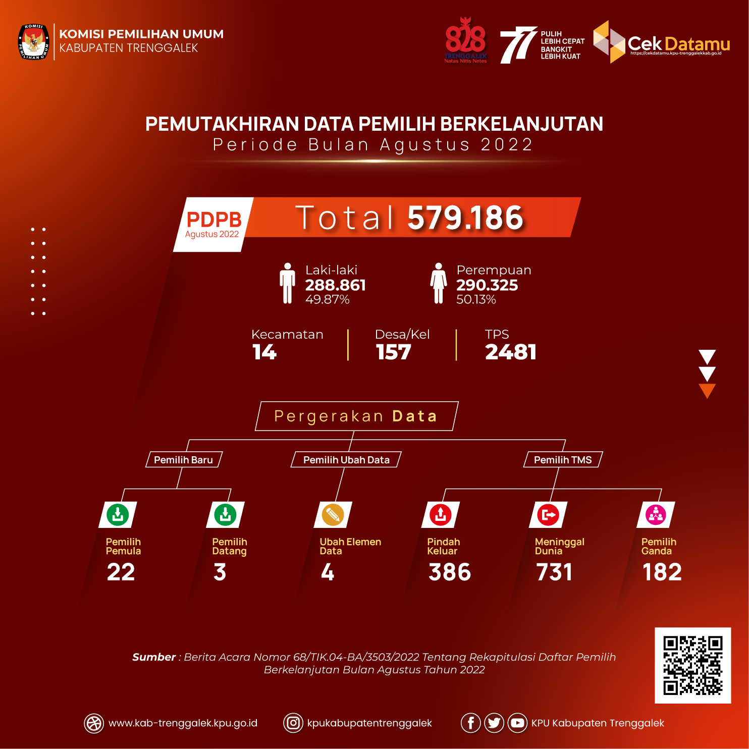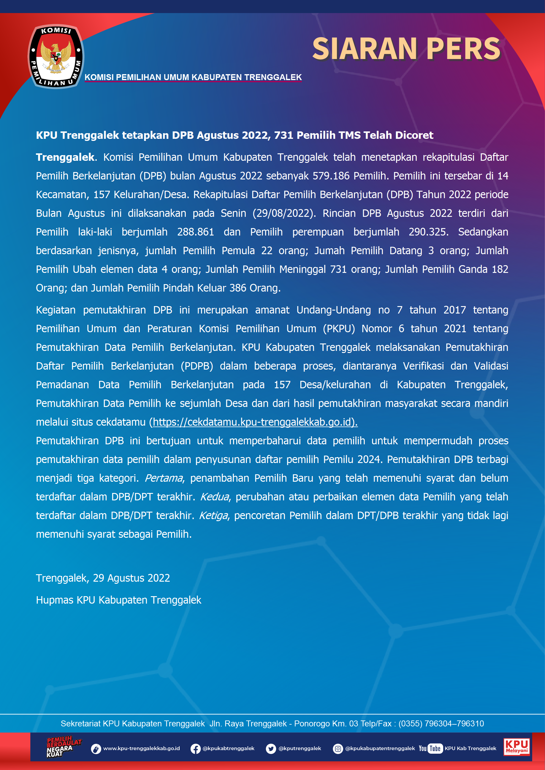 Berdasarkan Berita Acara Komisi Pemilihan Umum Kabupaten Trenggalek Nomor 68/TIK.04-BA/3503/2022 tanggal 29 Agustus 2022 tentang Rekapitulasi Daftar Pemilih Berkelanjutan Bulan Agustus Tahun 2022, Berikut kami sampaikan Daftar Pemilih Berkelanjutan Periode Bulan Agustus Tahun 2022 sebagimana terlampir.