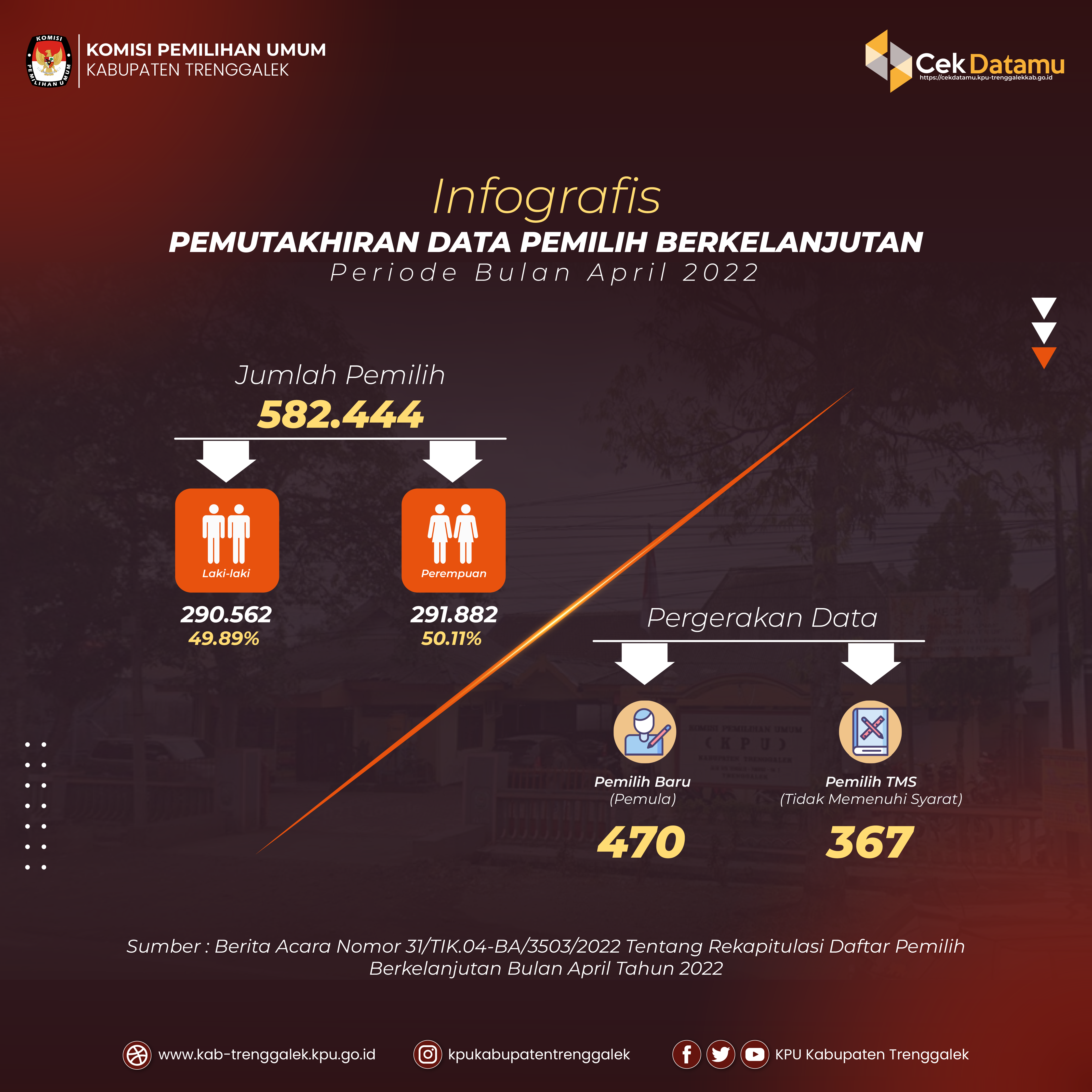 Berikut disampaikan pengumuman Nomor : 274/TIK.04/3503/2022 tentang Daftar Pemilih Berkelanjutan Kabupaten Trenggalek Bulan April Tahun 2022. Berdasarkan Berita Acara Komisi Pemilihan Umum Kabupaten Trenggalek Nomor 31/TIK.04-BA/3503/2022 tanggal 28 April 2022 tentang Rapat Pleno Rekapitulasi Daftar Pemilih Berkelanjutan Tahun 2022 periode Bulan April, Berikut kami sampaikan Daftar Pemilih Berkelanjutan Periode Bulan April Tahun 2022 sebagimana terlampir.