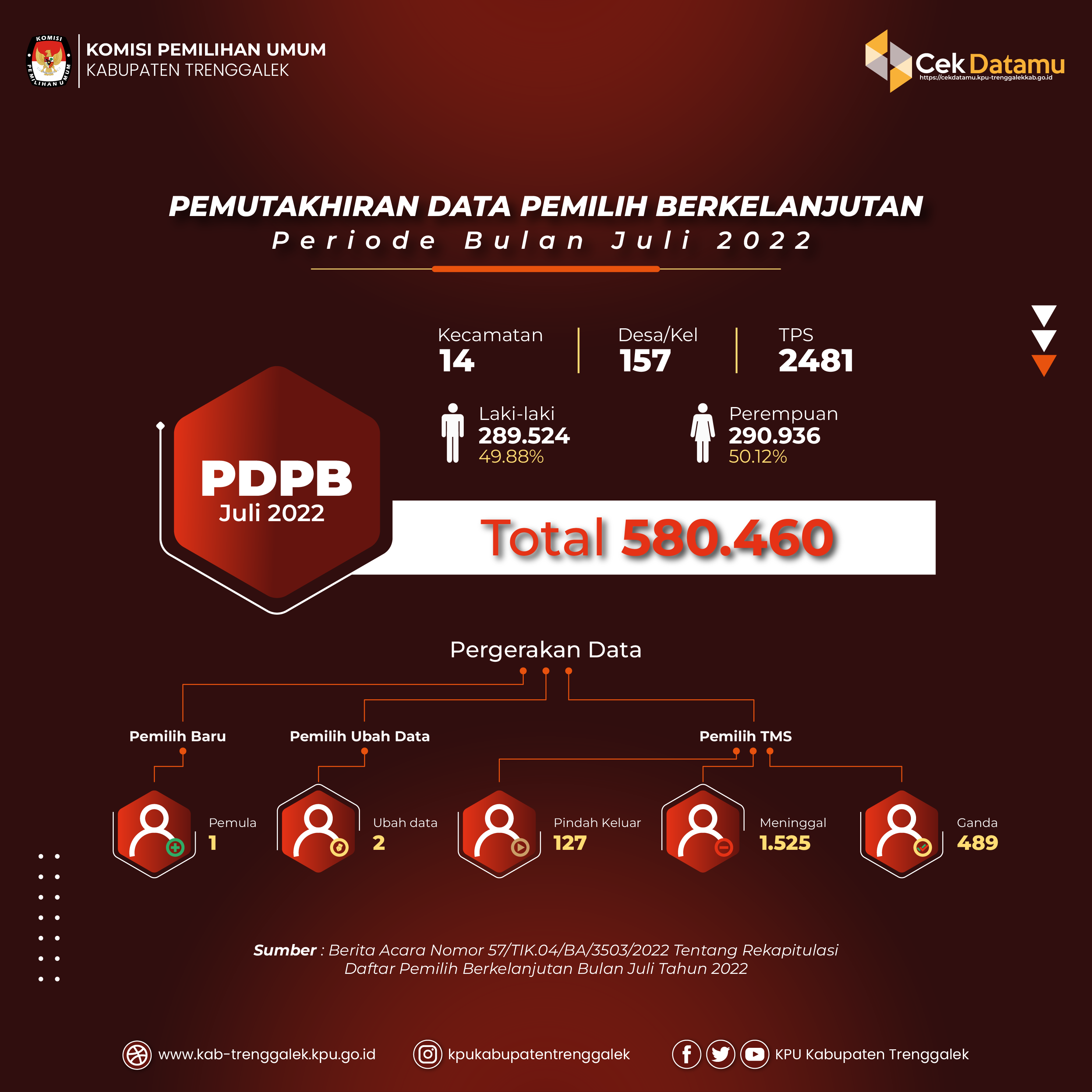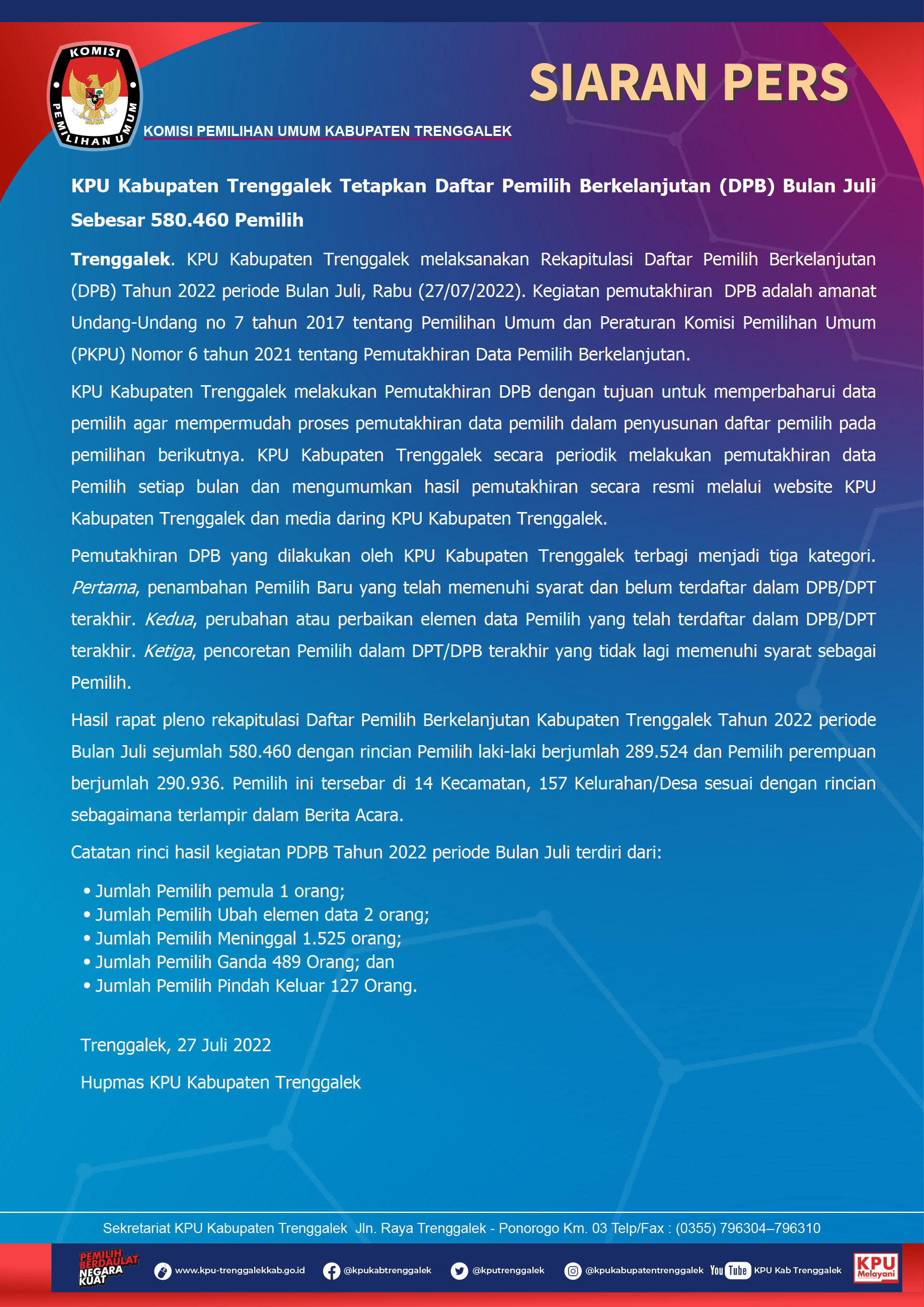 Berdasarkan Berita Acara Komisi Pemilihan Umum Kabupaten Trenggalek Nomor 57/TIK.04/BA/3503/2022 tanggal 27 Juli 2022 tentang Rekapitulasi Daftar Pemilih Berkelanjutan Bulan Juli Tahun 2022, Berikut kami sampaikan Daftar Pemilih Berkelanjutan Periode Bulan Juli Tahun 2022 sebagimana terlampir.
