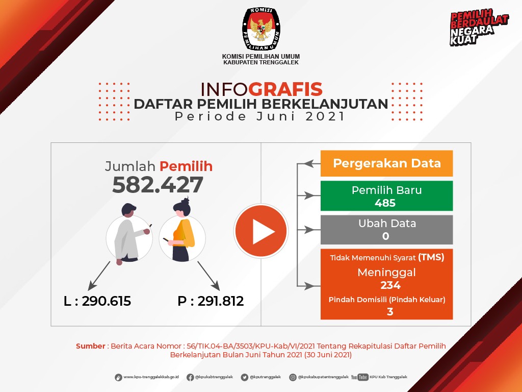 Berdasarkan Berita Acara Komisi Pemilihan Umum Kabupaten Trenggalek Nomor 56/TIK.04-BA/3503/KPU-Kab/VI/2021 tanggal 30 Juni 2021 tentang Rekapitulasi Daftar Pemilih Berkelanjutan Bulan Juni 2021, berikut kami sampaikan Daftar Pemilih Berkelanjutan Bulan Juni 2021 sebagimana terlampir.
