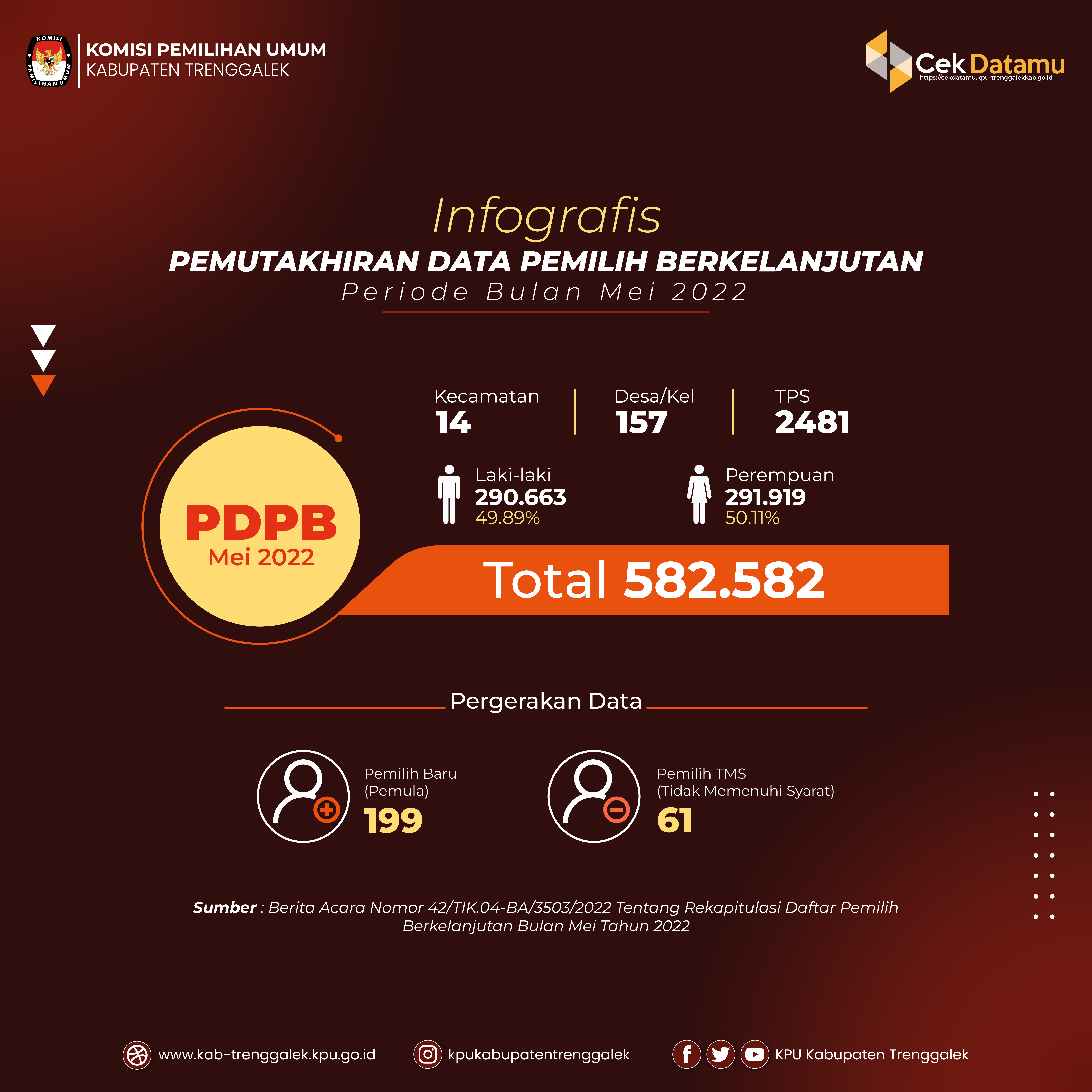 Berdasarkan Berita Acara Komisi Pemilihan Umum Kabupaten Trenggalek Nomor 42/TIK.04-BA/3503/2022 tanggal 27 Mei 2022 tentang Rapat Pleno Rekapitulasi Daftar Pemilih Berkelanjutan Tahun 2022 periode Bulan Mei, Berikut kami sampaikan Daftar Pemilih Berkelanjutan Periode Bulan Mei Tahun 2022 sebagimana terlampir.