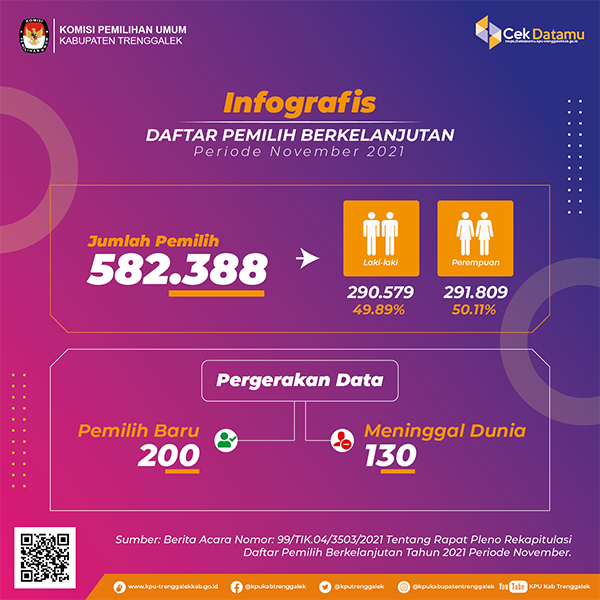 Berdasarkan Berita Acara Komisi Pemilihan Umum Kabupaten Trenggalek Nomor: 99/TIK.04/3503/2021 tanggal 26 November 2021 tentang Rapat Pleno Rekapitulasi Daftar Pemilih Berkelanjutan Tahun 2021 Periode November, berikut kami sampaikan Daftar Pemilih Berkelanjutan Bulan November 2021 sebagimana terlampir.