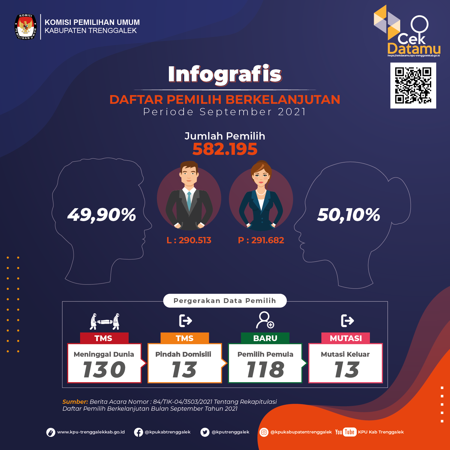 Berdasarkan Berita Acara Komisi Pemilihan Umum Kabupaten Trenggalek Nomor: 84/TIK-04/3503/2021 tanggal 30 September 2021 tentang Rekapitulasi Daftar Pemilih Berkelanjutan Bulan September 2021, berikut kami sampaikan Daftar Pemilih Berkelanjutan Bulan September 2021 sebagimana terlampir.