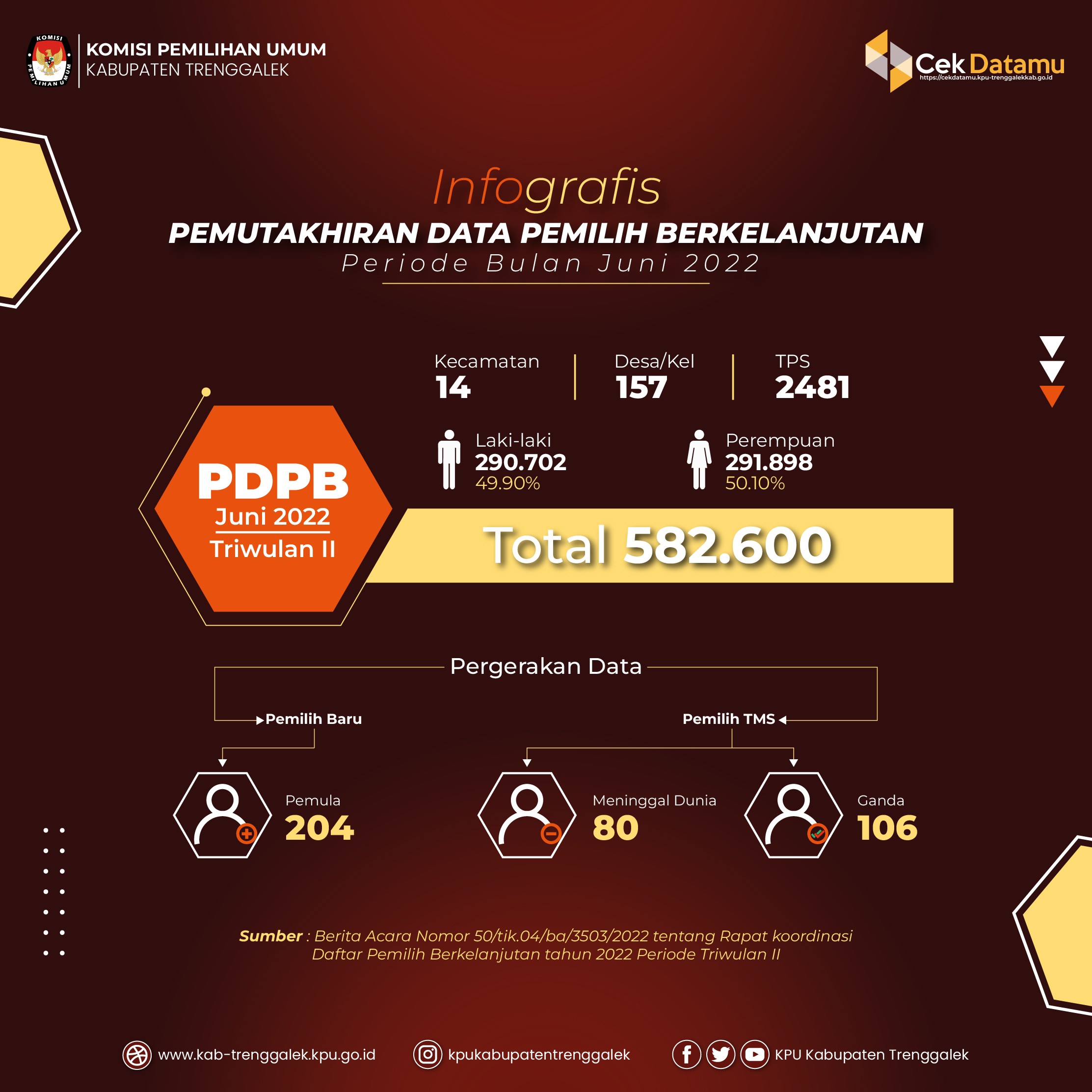 Berdasarkan Berita Acara Komisi Pemilihan Umum Kabupaten Trenggalek Nomor: 50/TIK.04-BA/3503/2022 tanggal 27 Juni 2022 tentang Rapat Koordinasi Daftar Pemilih Berkelanjutan Tahun 2022 Periode Triwulan II, berikut kami sampaikan Daftar Pemilih Berkelanjutan Periode Triwulan II Tahun 2022 sebagaimana terlampir.