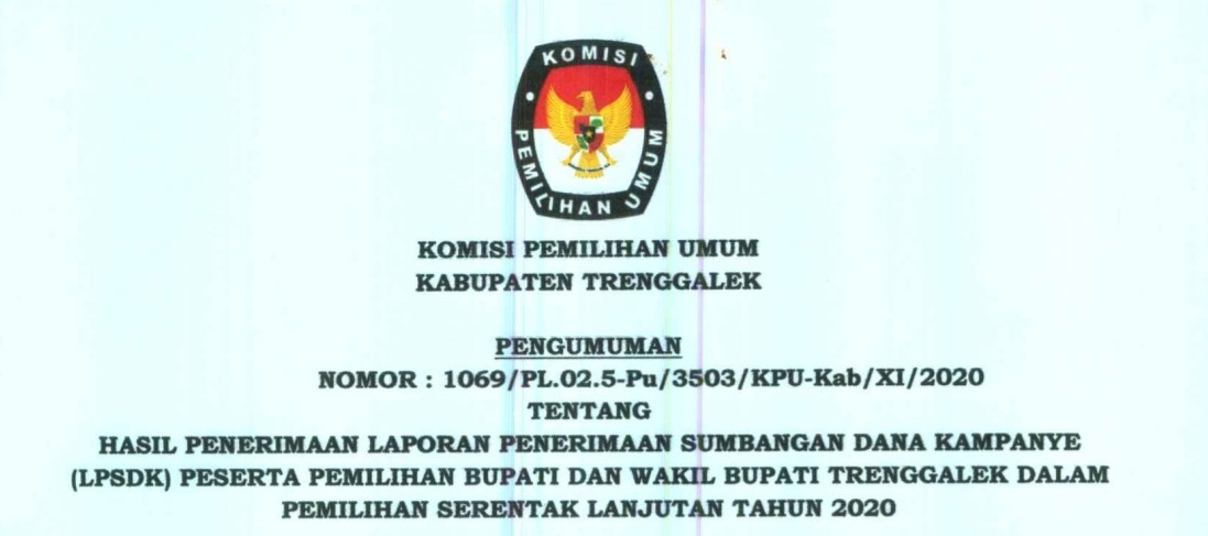PENGUMUMAN: HASIL PENERIMAAN LAPORAN PENERIMAAN SUMBANGAN DANA KAMPANYE (LPSDK) PESERTA PEMILIHAN BUPATI DAN WAKIL BUPATI TRENGGALEK DALAM PEMILIHAN SERENTAK LANJUTAN TAHUN 2020