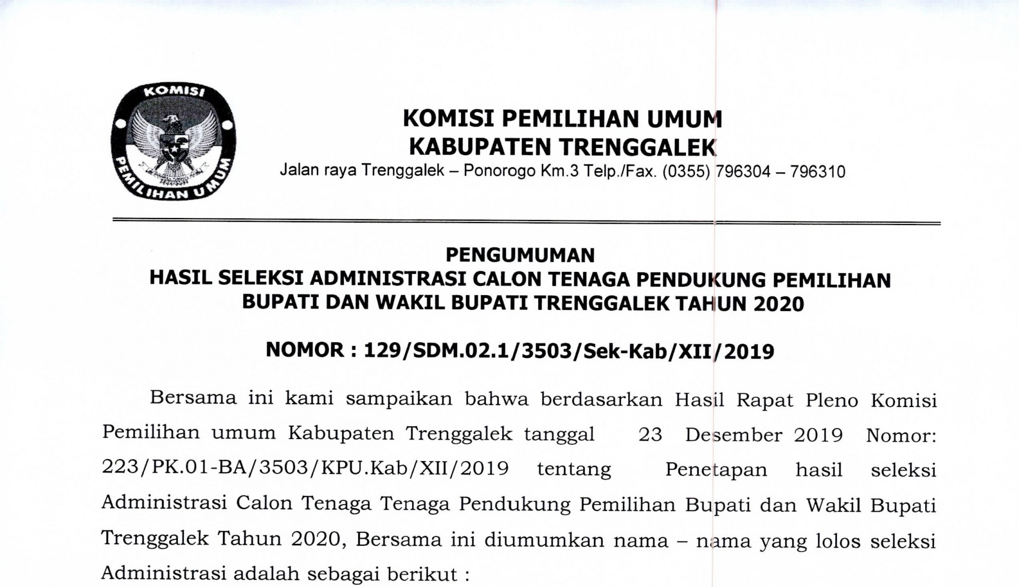Berikut disampaikan pengumuman Nomor : 129/SDM.02.1/3503/Sek-Kab/XII/2019 Tentang Hasil Seleksi Administrasi Calon Tenaga Pendukung Pemilihan Bupati dan Wakil Bupati Trenggalek Tahun 2020.