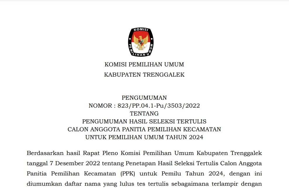 Berdasarkan hasil Rapat Pleno Komisi Pemilihan Umum Kabupaten Trenggalek tanggal 7 Desember 2022 tentang Penetapan Hasil Seleksi Tertulis Calon Anggota Panitia Pemilihan Kecamatan (PPK) untuk Pemilu Tahun 2024, dengan ini diumumkan daftar nama yang lulus tes tertulis sebagaimana terlampir. Peserta yang lolos Tes Tertulis selanjutnya mengikuti tes wawancara pada tanggal 11 – 13 Desember 2022 bertempat di Kantor KPU Kabupaten Trenggalek.