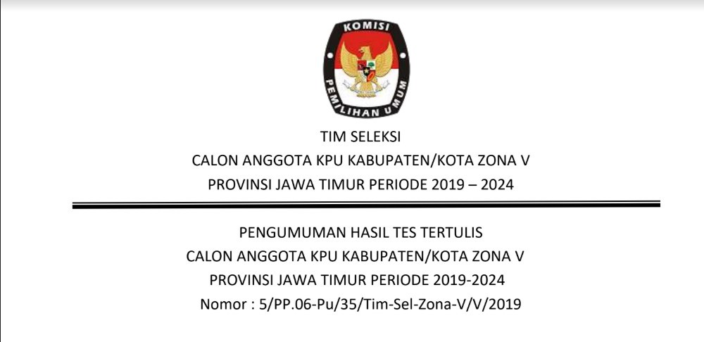 PENGUMUMAN HASIL TES TULIS CALON ANGGOTA KPU KAB/ KOTA ZONA V PROVINSI JAWA TIMUR PERIODE 2019-2024