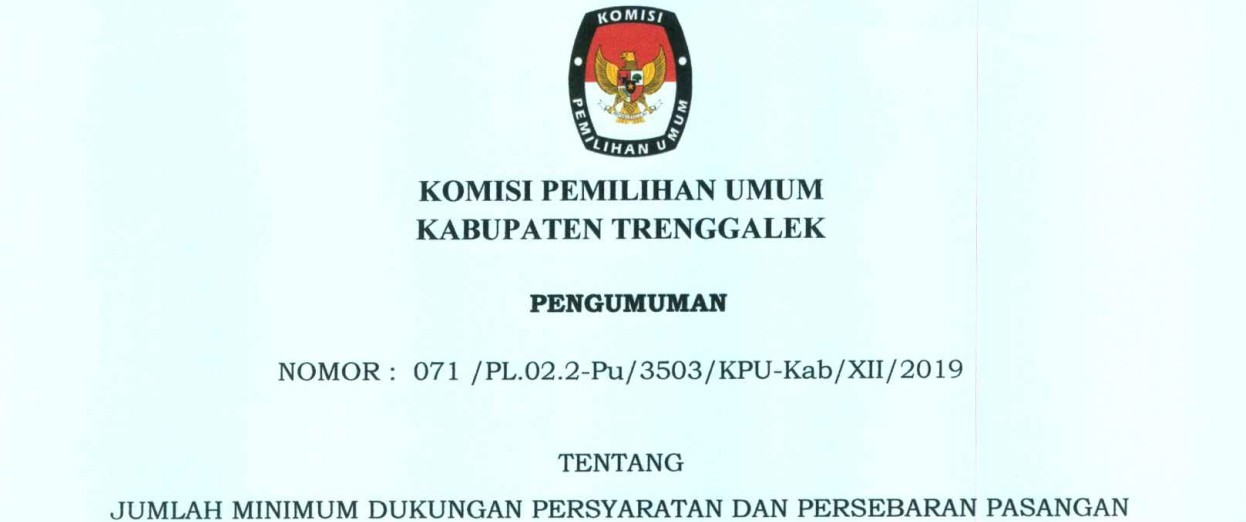 Berikut disampaikan pengumuman Nomor: 071/PL.02.2-Pu/3503/KPU-Kab/XII/2019 Tentang Jumlah Minimum Dukungan Persyaratan dan Persebaran Pasangan Calon Perseorangan dalam Pemilihan Bupati dan Wakil Bupati Trenggalek Tahun 2020.