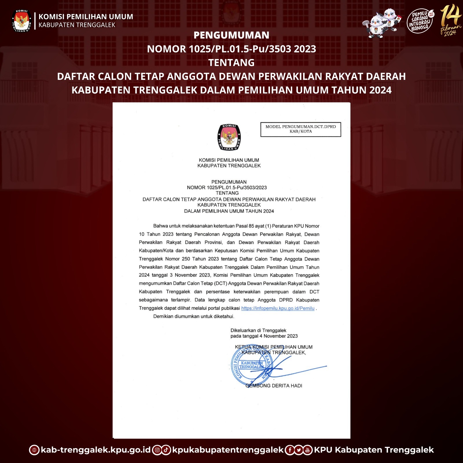 PENGUMUMAN NOMOR 1025/PL.01.5-Pu/3503/2023 TENTANG DAFTAR CALON TETAP ANGGOTA DEWAN PERWAKILAN RAKYAT DAERAH KABUPATEN TRENGGALEK DALAM PEMILIHAN UMUM TAHUN 2024