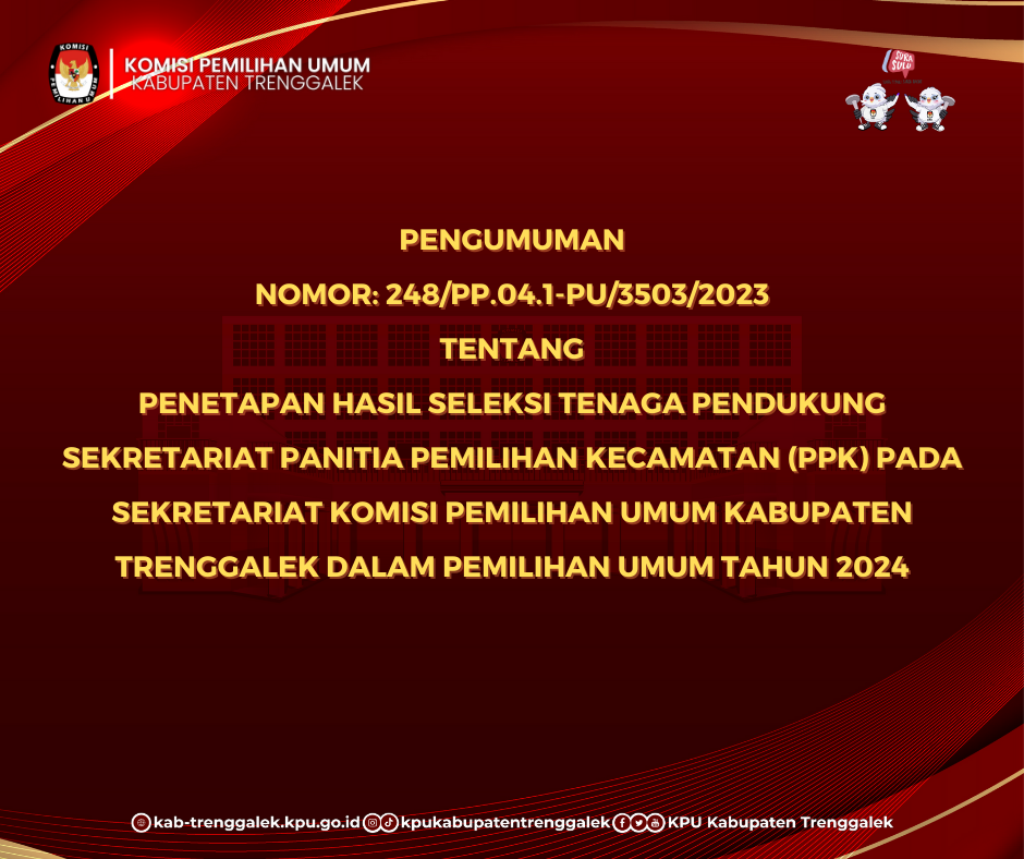 Berdasarkan Berita Acara Nomor : 252/PP.04.1-BA/3503/2023 pada Hari Senin Tanggal Enam Bulan Maret Tahun Dua Ribu Dua Puluh Tiga tentang Penetapan Hasil Wawancara Seleksi Tenaga Pendukung Sekretariat Panitia Pemilihan Kecamatan Pada Komisi Pemilihan Umum Kabupaten Trenggalek, diumumkan bahwa KPU Kabupaten Trenggalek menetapkan Tenaga Pendukung Sekretariat Panitia Pemilihan Kecamatan (PPK) terpilih sebagaimana terlampir dan keputusan dari panitia seleksi tenaga pendukung sekretariat panitia pemilihan kecamatan (PPK) pada Sekretariat Komisi Pemilihan Umum Kabupaten Trenggalek adalah mutlak dan tidak dapat diganggu gugat.