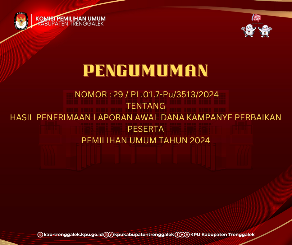 PENGUMUMAN NOMOR : 29 / PL.01.7-Pu/3513/2024 TENTANG HASIL PENERIMAAN LAPORAN AWAL DANA KAMPANYE PERBAIKAN PESERTA PEMILIHAN UMUM TAHUN 2024