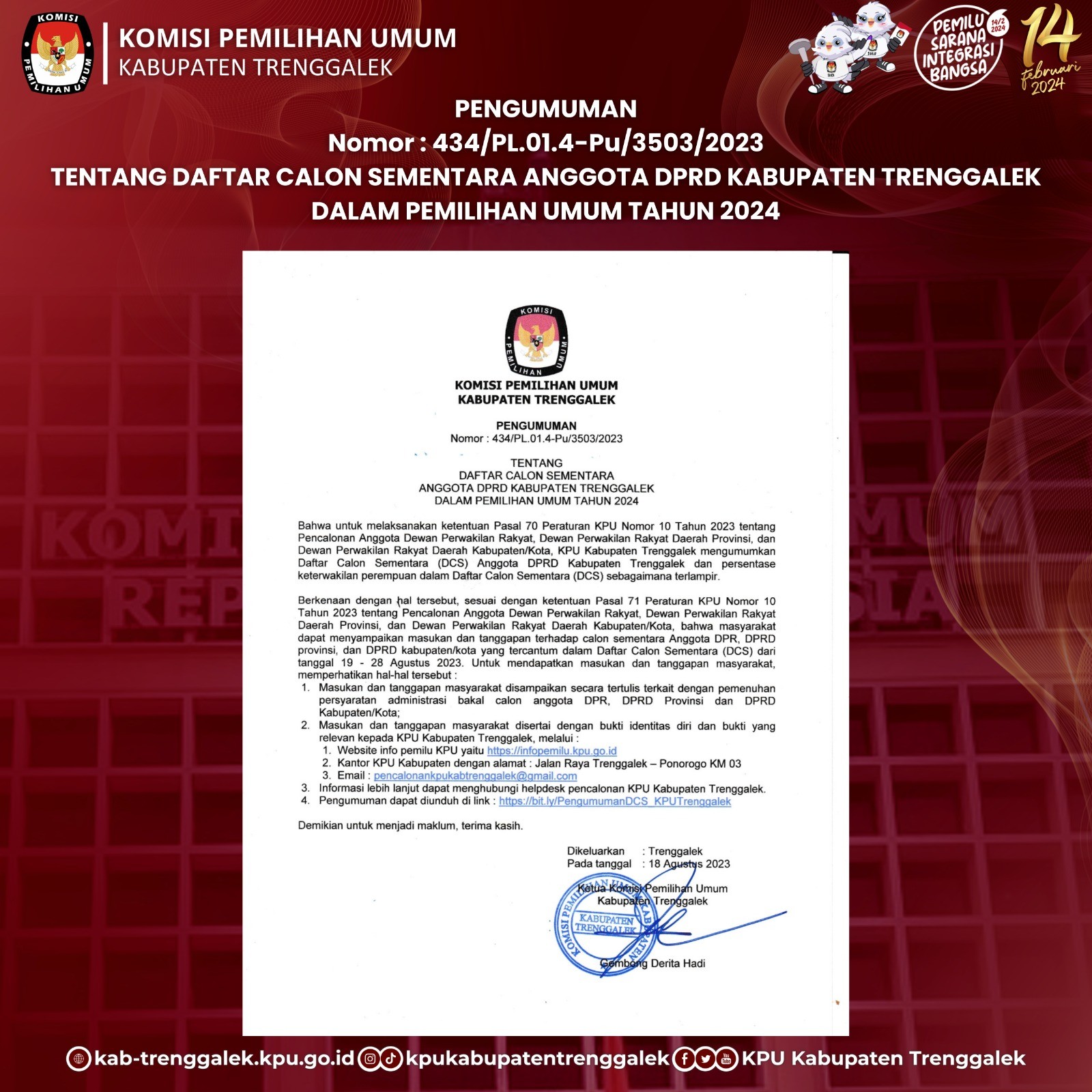PENGUMUMAN NOMOR : 434/PL.01.4-Pu/3503/2023 TENTANG DAFTAR CALON SEMENTARA ANGGOTA DPRD KABUPATEN TRENGGALEK DALAM PEMILIHAN UMUM TAHUN 2024