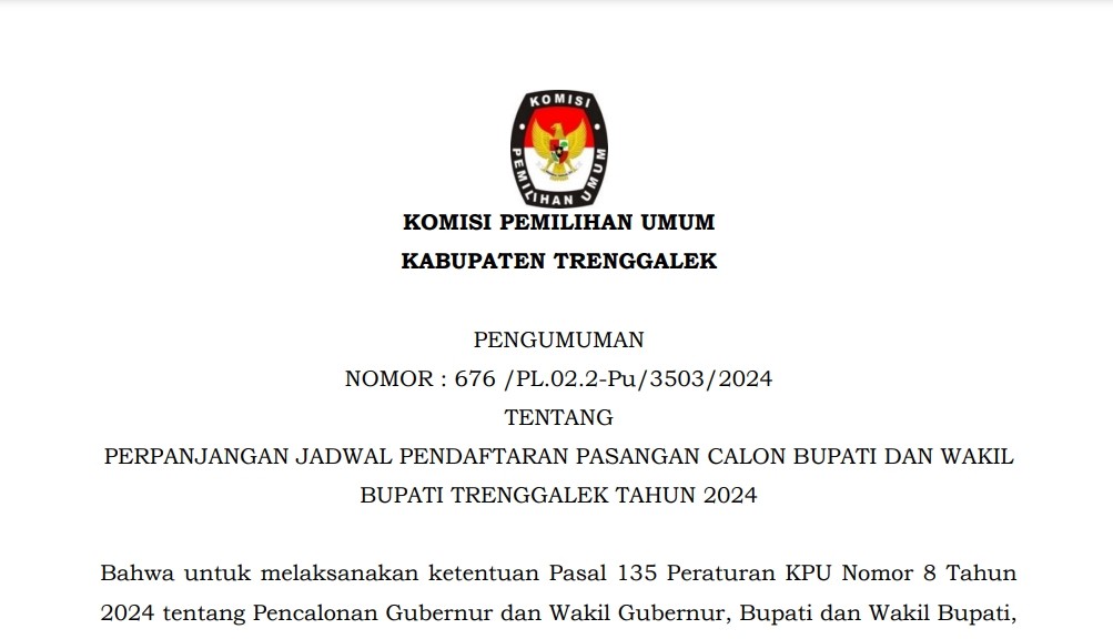 PENGUMUMAN NOMOR: 676/PL.02.2-Pu/3503/2024 TENTANG PERPANJANGAN JADWAL PENDAFTARAN PASANGAN CALON BUPATI DAN WAKIL BUPATI TRENGGALEK TAHUN 2024