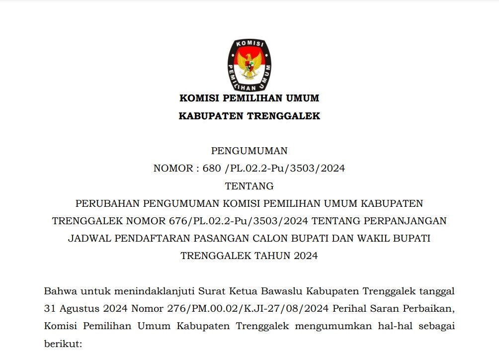 PENGUMUMAN NOMOR 680/PL.02.2-Pu/3503/2024 TENTANG PERUBAHAN PENGUMUMAN NOMOR 676/PL.02.2-Pu/3503/2024 TENTANG PERPANJANGAN JADWAL PENDAFTARAN PASLON BUPATI WAKIL BUPATI TRENGGALEK 2024