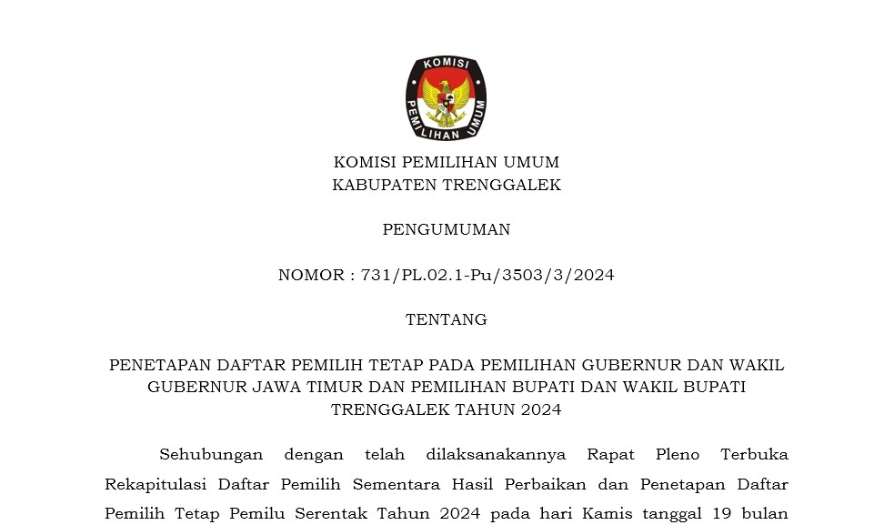 Berikut disampaikan Pengumuman Nomor: 731/Pl.02.1-Pu/3503/3/2024 Tentang Penetapan Daftar Pemilih Tetap pada Pemilihan Gubernur dan Wakil Gubernur Jawa Timur dan Pemilihan Bupati dan Wakil Bupati Trenggalek Tahun 2024.