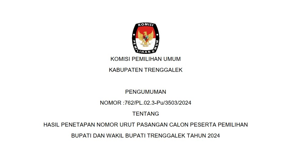 Berikut disampaikan Pengumuman Nomor: 762/Pl.02.3-Pu/3503/2024 Tentang Hasil Penetapan Nomor Urut Pasangan Calon Peserta Pemilihan Bupati dan Wakil Bupati Trenggalek Tahun 2024.