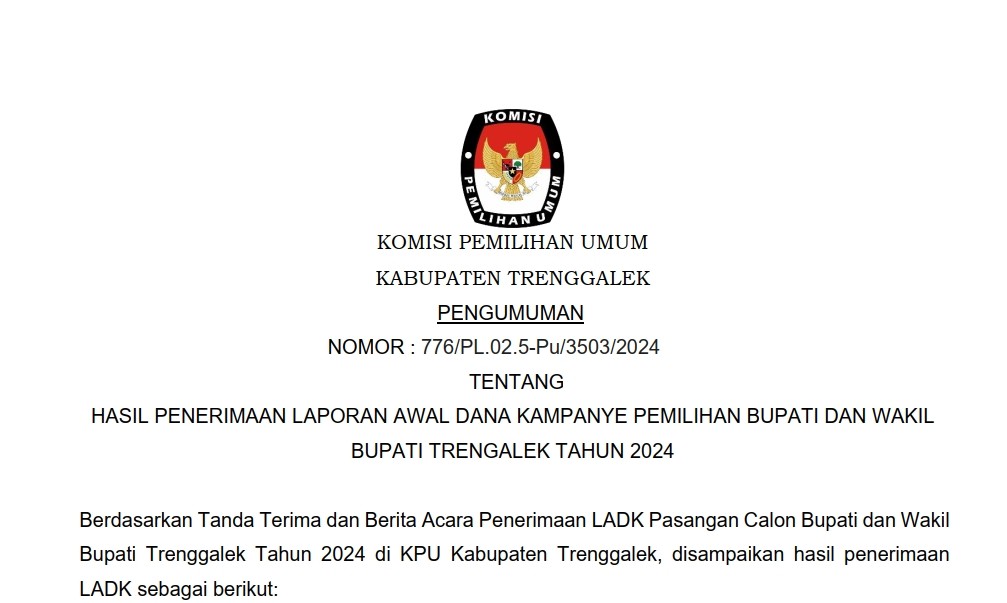 PENGUMUMAN NOMOR: 776/PL.02.5-Pu/3503/2024 TENTANG HASIL PENERIMAAN LAPORAN AWAL DANA KAMPANYE PEMILIHAN BUPATI DAN WAKIL BUPATI TRENGALEK TAHUN 2024