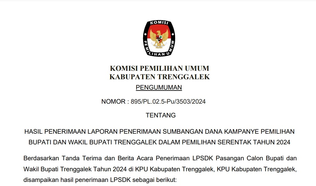 PENGUMUMAN NOMOR: 895/PL.02.5-Pu/3503/2024 TENTANG HASIL PENERIMAAN LAPORAN PENERIMAAN SUMBANGAN DANA KAMPANYE PEMILIHAN BUPATI DAN WAKIL BUPATI TRENGGALEK PEMILIHAN SERENTAK 2024