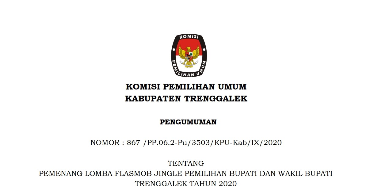 Berikut disampaikan Pengumuman Nomor : 867 /PP.06.2-Pu/3503/KPU-Kab/IX/2020 Tentang Pemenang Lomba Flasmob Jingle Pemilihan Bupati Dan Wakil Bupati Trenggalek Tahun 2020.