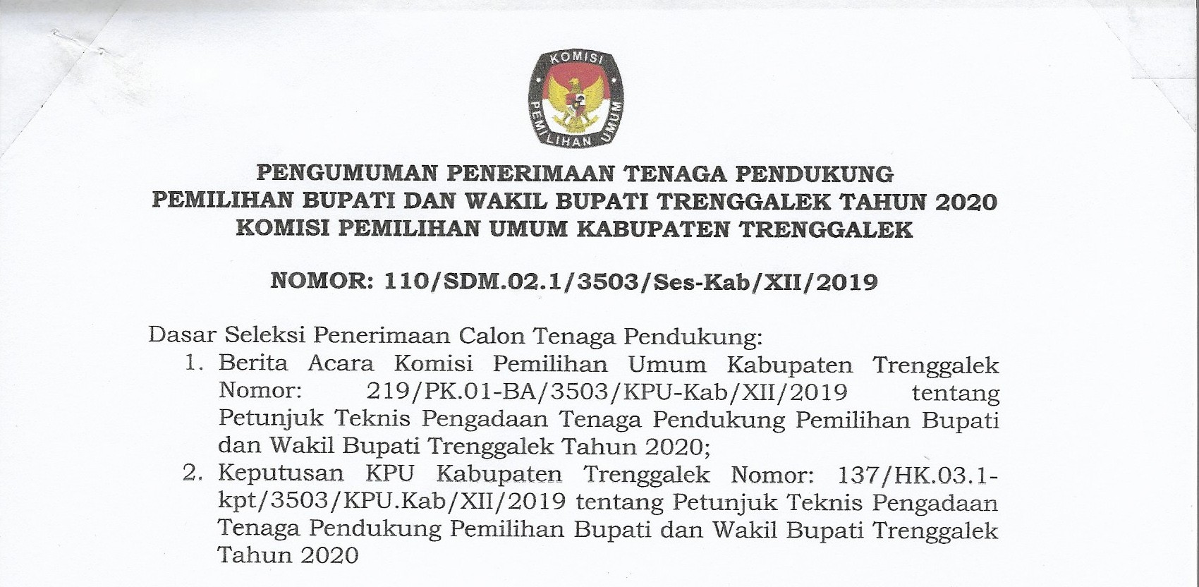 Berikut disampaikan pengumuman tentang penerimaan Tenaga Pendukung dalam Pemilihan Bupati dan Wakil Bupati Trenggalek Tahun 2020.